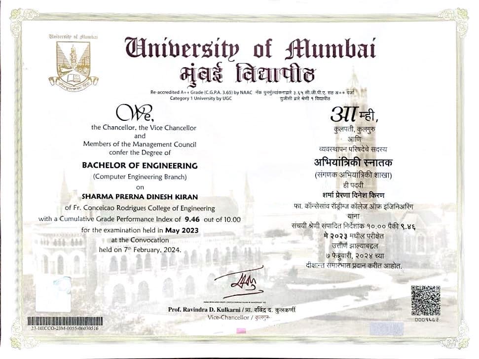 Prerna scored a perfect 10 pointer in 3 semesters and graduated college first in her class with a CGPA of 9.46